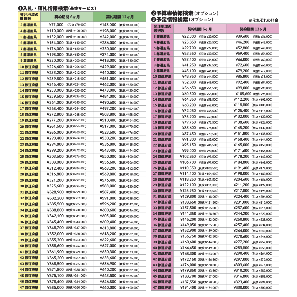 ②予算書情報検索③予定情報検索は追加オプションになります。選択地域は基本サービスと同じになり、追加オプションのみのご契約はできません。②と③の両方をご契約の場合はオプション料金が20%割引になります。